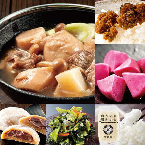 セット内容は、「米沢牛いも煮(2人前)」、「新米雪若丸(2合)」「手作りのとち餅(3ヶ)」
