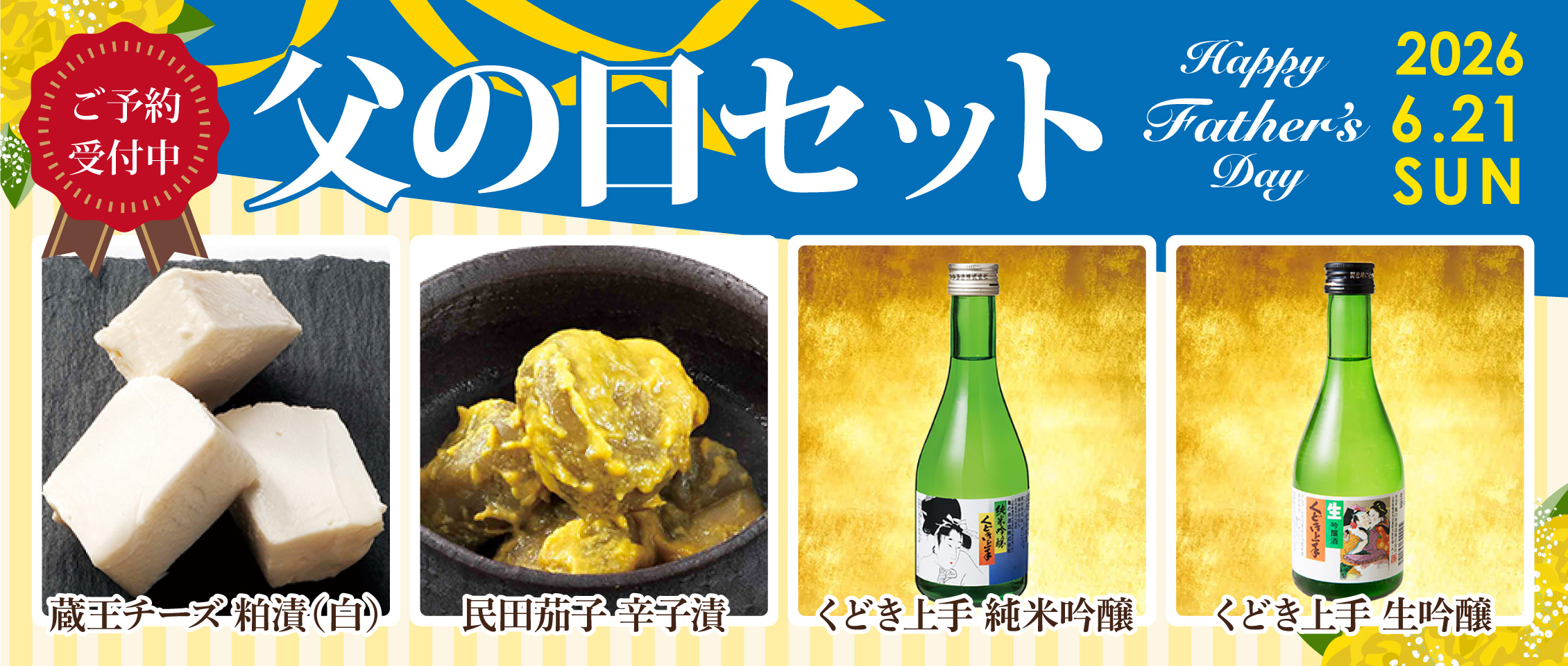 人気の「亀の井酒造」の日本酒「くどき上手」2本と、酒の肴として、「民田茄子からし漬」」「蔵王チーズ粕漬(白)」の詰合せになります。