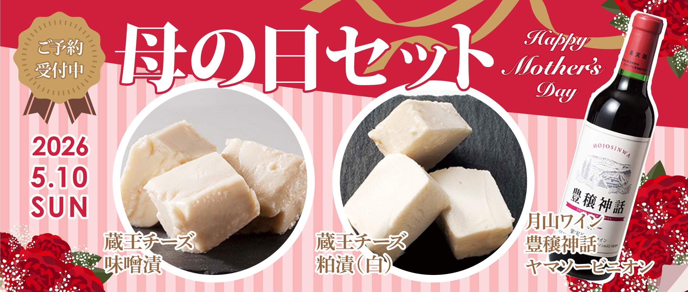 【母の日ギフト】は、月山ワイン「豊穣神話 赤」と、蔵王クリームチーズの漬物2種の詰合せ