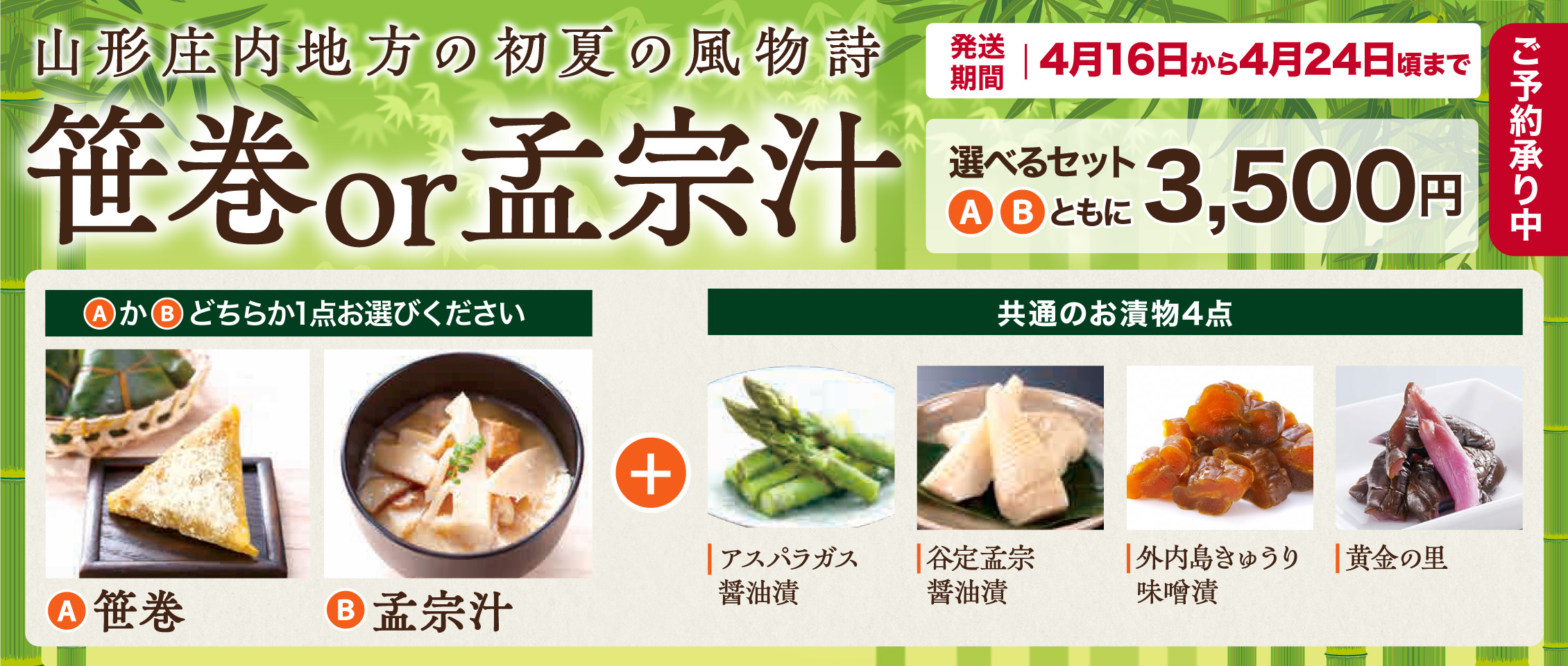 毎年大好評をいただいております、山形庄内地方の初夏の風物詩「笹巻」と「孟宗汁」が選べるセットの