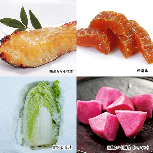 - 寒だらみそ粕漬(1切×3袋)、粕漬瓜×1袋、雪下白菜漬×1袋、温海かぶ甘酢漬(スライス)×1袋
